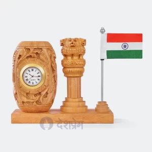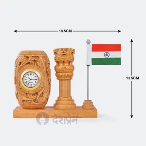 Wooden Ashok Stambh With Clock Pen Stand And Indian Flag